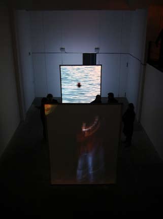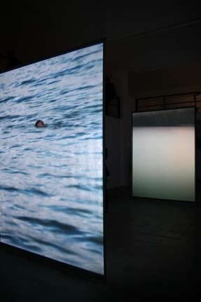 Auf der gegenüber hängenden Leinwand erleben wir als Betrachter die Situation zeitgleich aus dem Blickwinkel des Ertrinkenden. Die Subjektive dreht die Dynamik der Bilder um: Sie verhält sich entgegen der jeweiligen Situation, während der Ertrinkende in einem ganz ruhigen Bildausschnitt sichtbar wird, ist der Kameramann gänzlich verwackelt. Als Betrachter werden wir hilflos auf einer unsichtbaren Brücke zwischen beiden Protagonisten zurückgelassen.